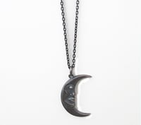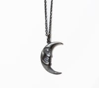 The moon man is 1 1/8" long. The imported Italian chain is 20" faceted silver, also oxidized. Allow 2-3 weeks.